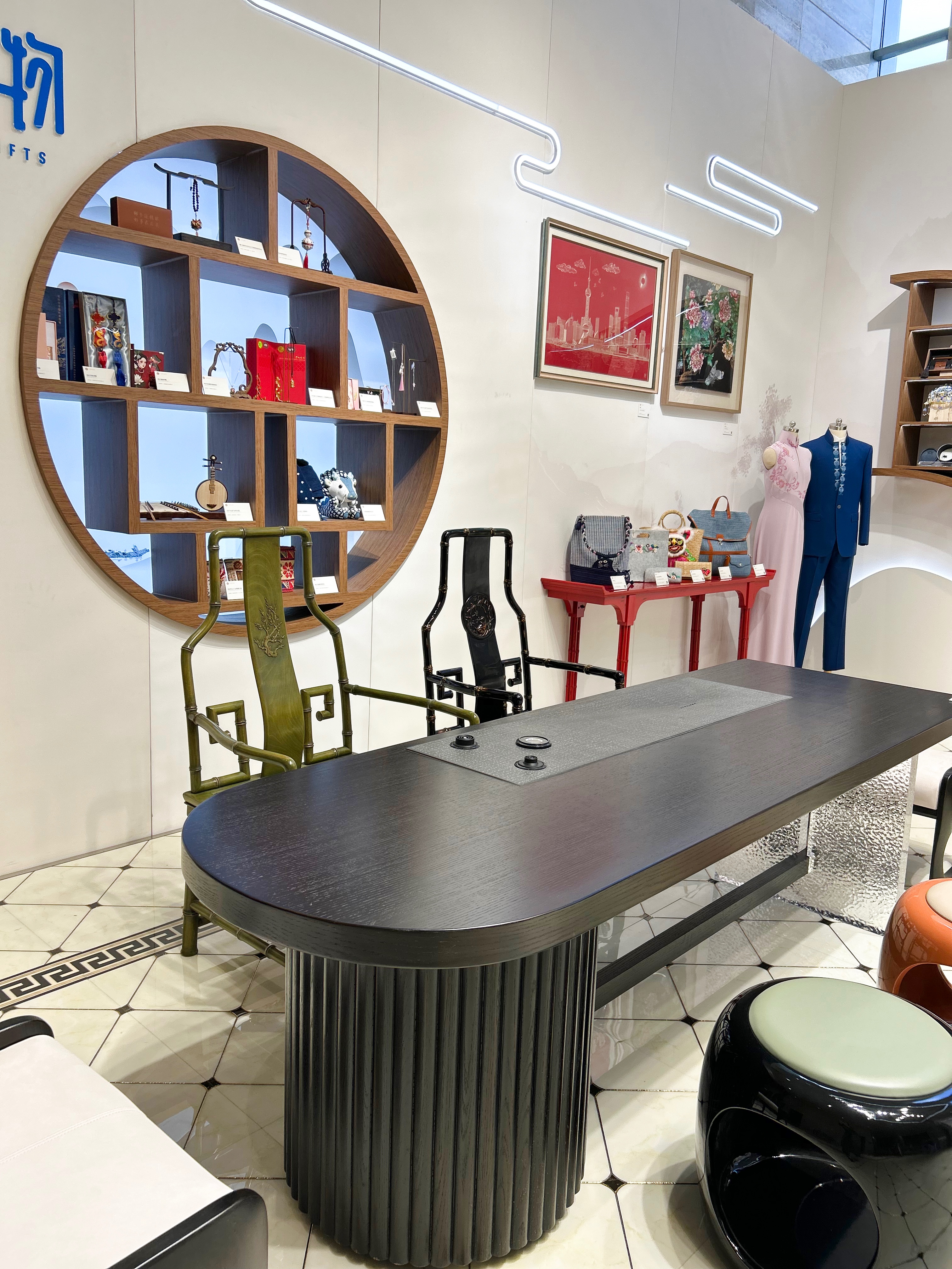 进博会新闻中心内的“上海非遗客厅”以“目之所及,皆是非遗”为布展理念,通过家具、壁龛、百宝格等元素,打造出兼具古典韵味与现代审美的文化空间。今年累计展示非遗项目89个,静态展品80件(套),其中亚振家居的海派家具制作技艺作为上海市非遗代表性项目,以三大系列作品成为焦点,生动诠释“遇见非遗,体验传统新生活”的深层内涵。