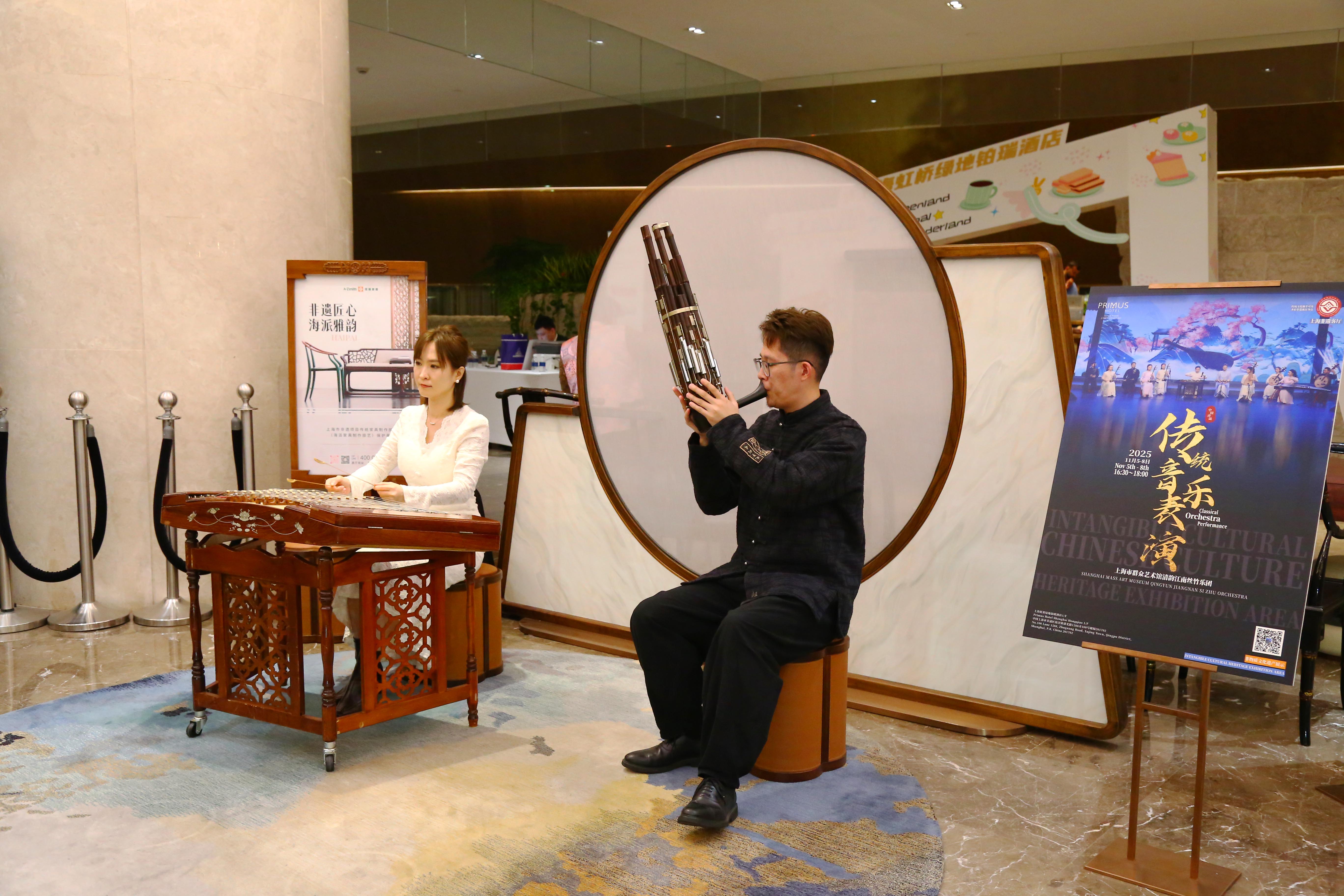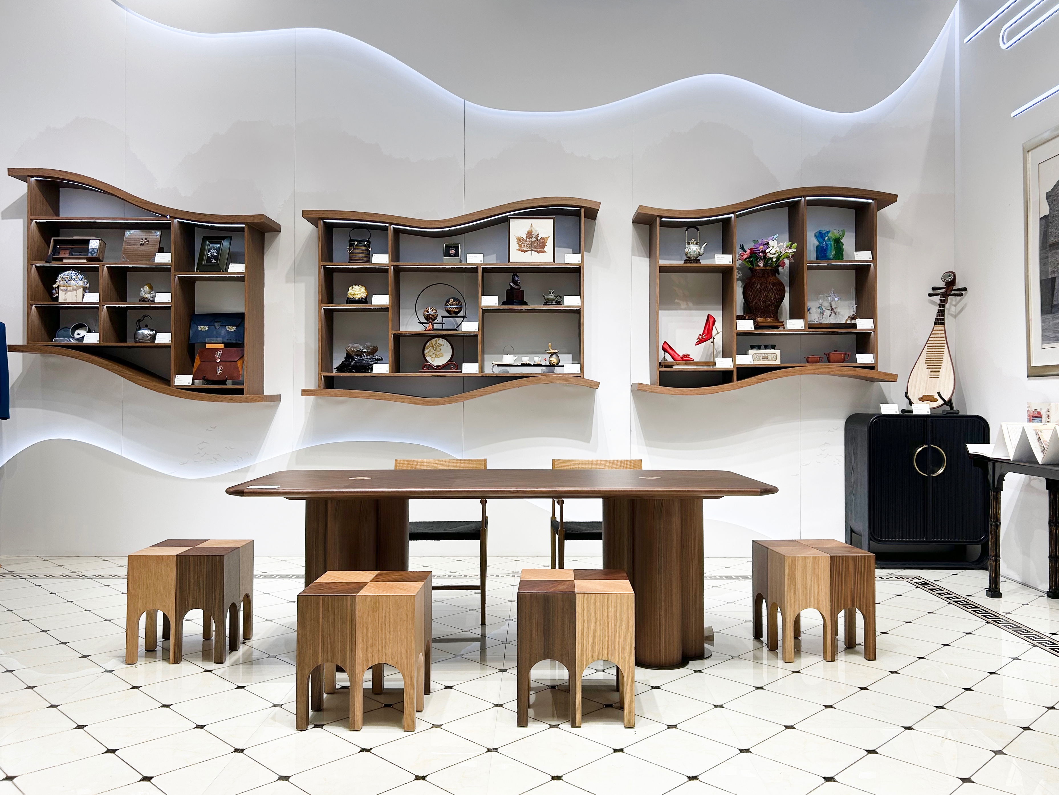 进博会期间,亚振家居在绿地铂瑞酒店分会场设置非遗互动体验区,展出「AZ1865屏风」、「本然妆凳」、「丝路台」等代表作,结合传统技艺表演与现场音乐演奏,让观众在沉浸式体验中感受木艺的肌理、乐声的流动,使非遗从“展柜故事”转化为“生活艺术”。