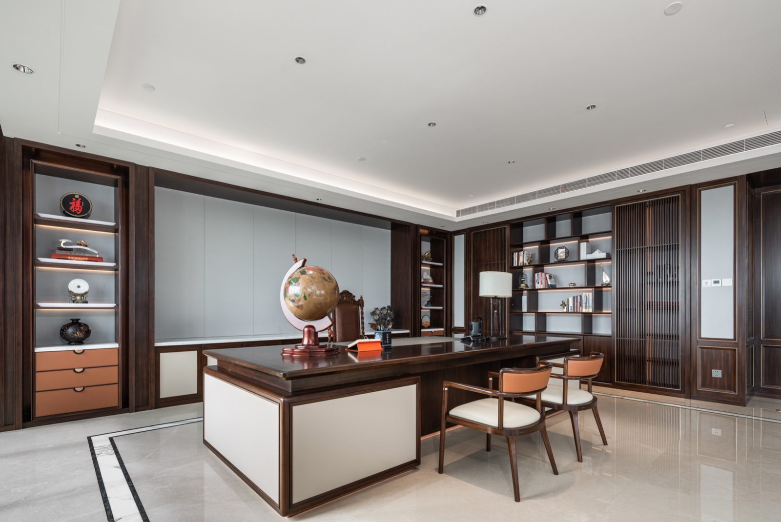 这是高层区域转角处的一间办公室,两面临窗,视野开阔,极目远眺亦是风景。室内空间宽敞,大开大合。新海派的全屋定制,取舍平衡,讲究对称之美。