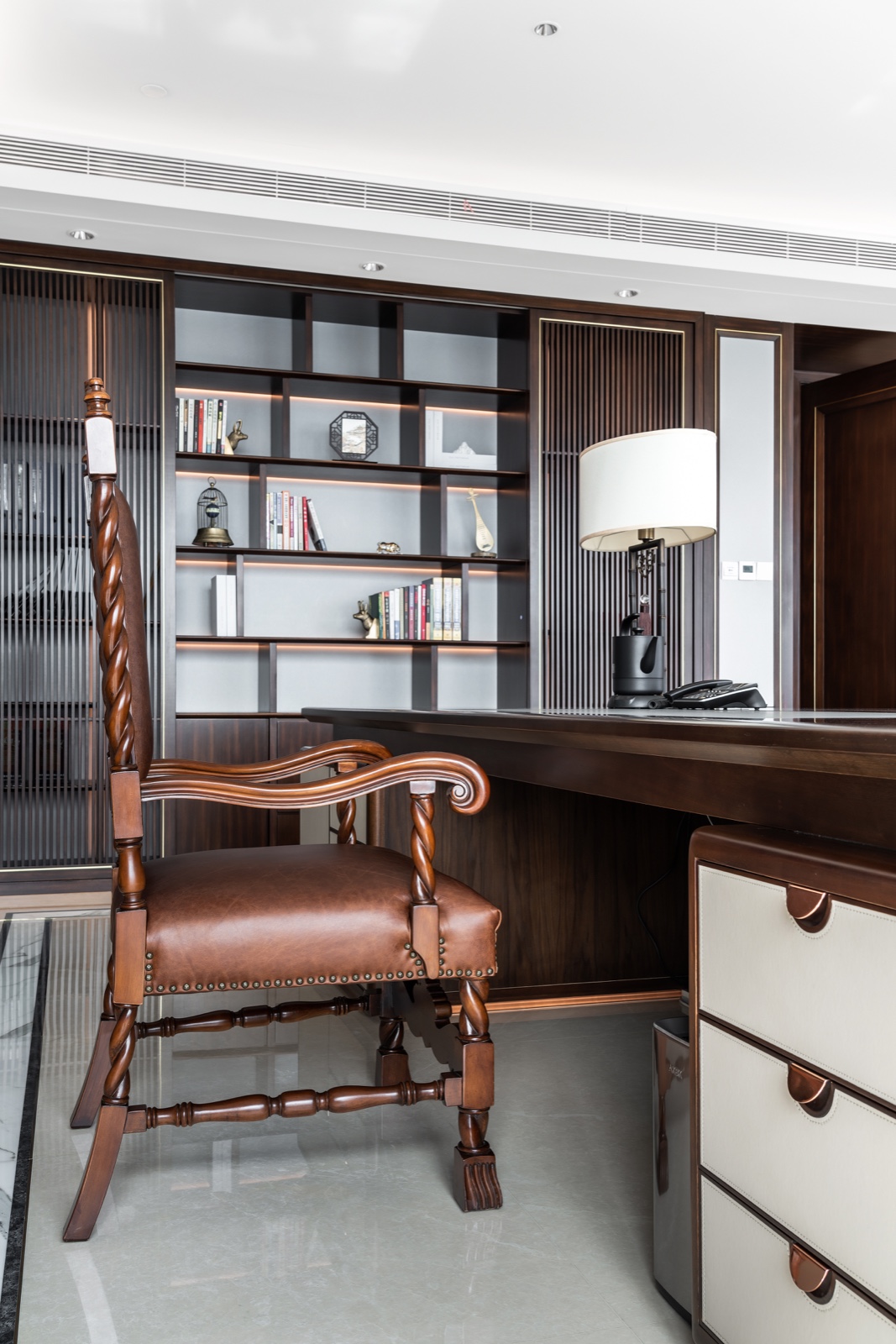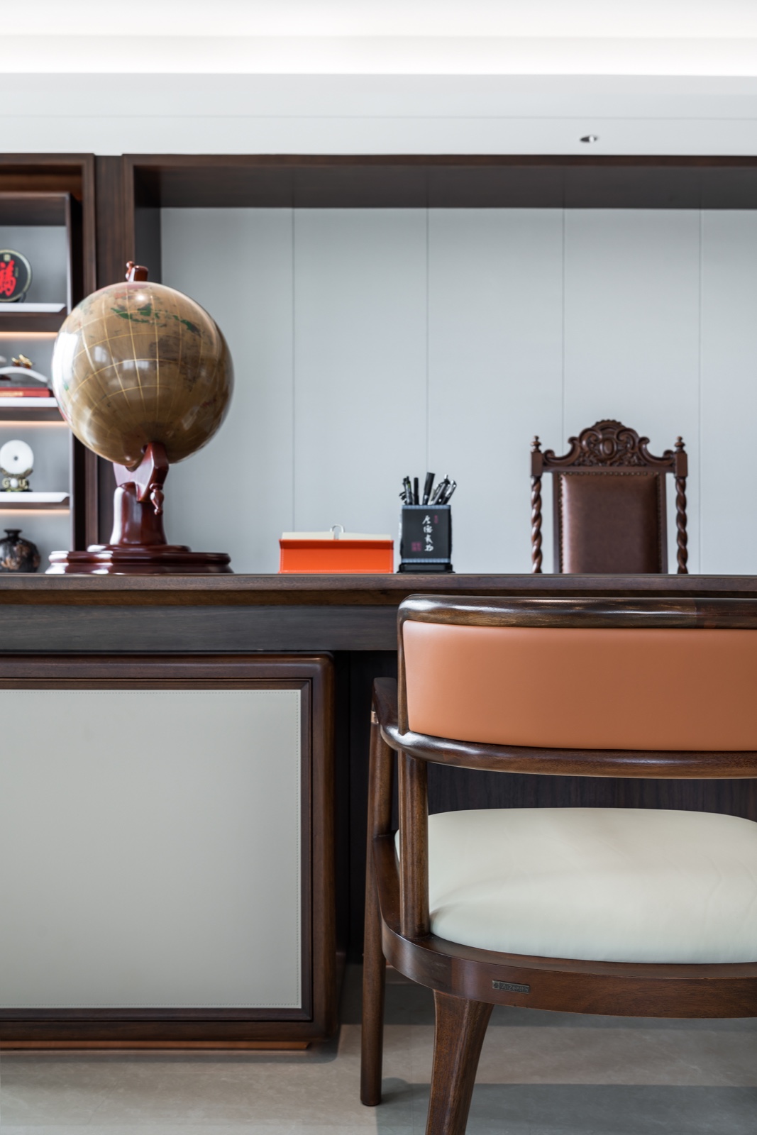 办公区,一张中式老板桌,极具海派风格——胡桃木的桌面与白鹭色皮质的抽屉柜搭配,简约时尚,很是气派。老板椅则选用了法式实木皮艺古典椅,雕刻精美,线条流畅,采用了传统的榫卯结构,稳如泰山。老板桌的大气体现了主人驰骋商场的气魄,老板椅的精致则流露了主人高雅的品位与品格。