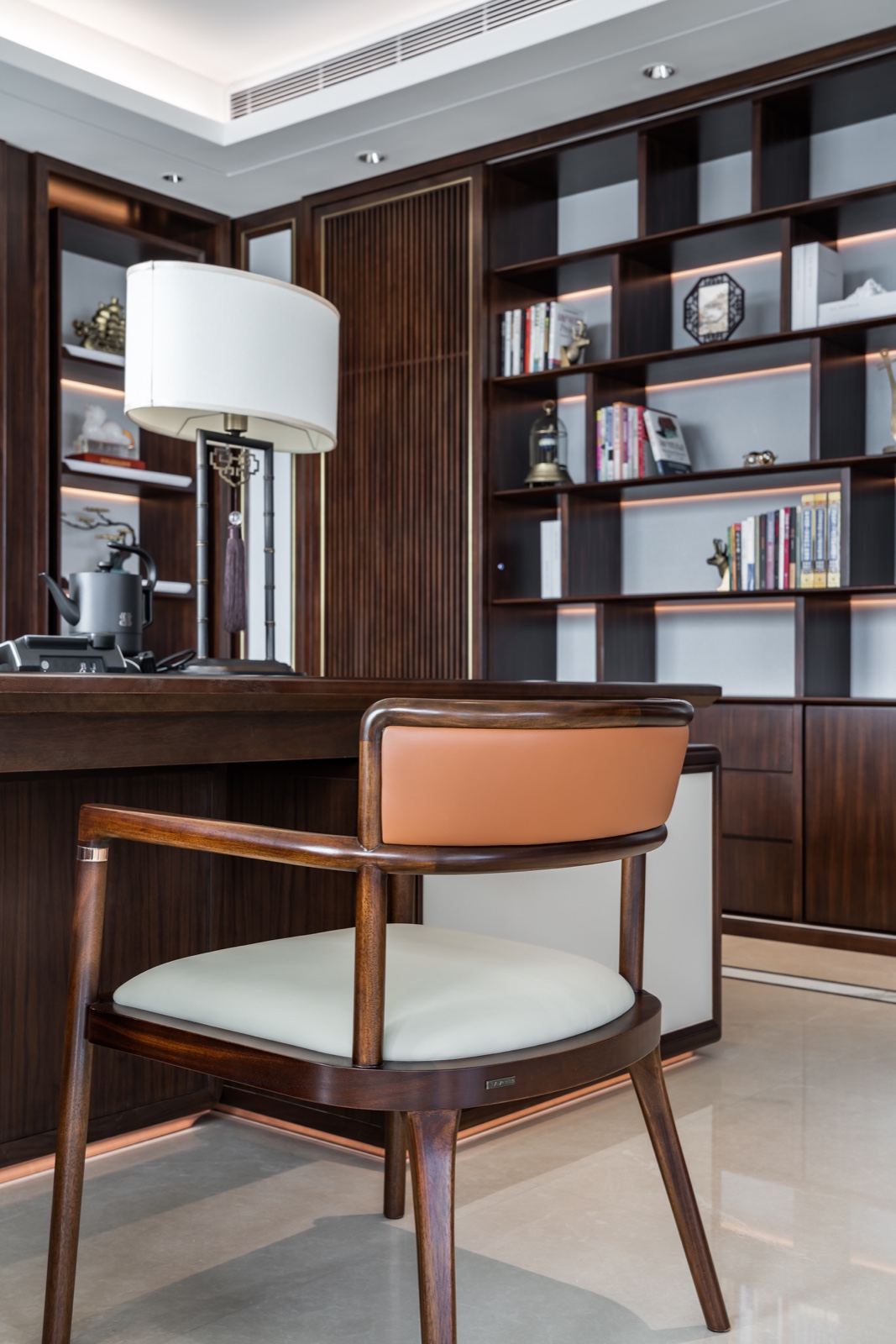 老板桌的另一侧摆放的两把会客椅则是实木软包,采用了橘色与白鹭色,同样线条简洁,给人以平和、踏实的感受。