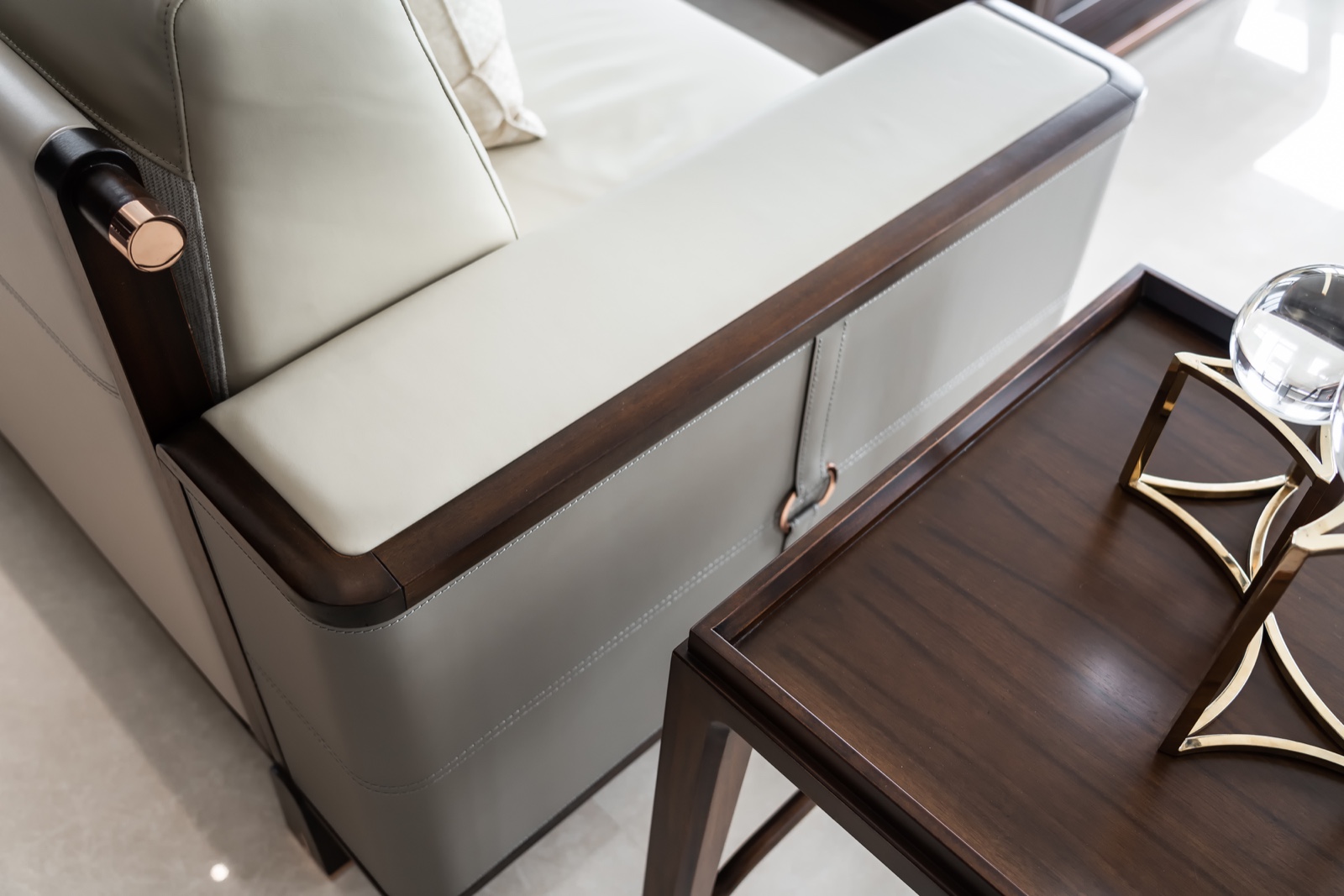 而会客区的空间布置,是以那把精美的老板椅为中轴线进行摆放。全实木整料打造的茶几,纹理清晰,做工精湛,流线型边条设计受力均匀,现代自然。一组皮质沙发,云雾色清新脱俗,金属配件带来的质感,精雕细琢——皮质与金属的碰撞,一柔一刚。在这里接待来客,可以是一场激烈的“头脑风暴”,抑或是品一壶好茶,天南海北地闲聊,也是一种调整、放松的方式。