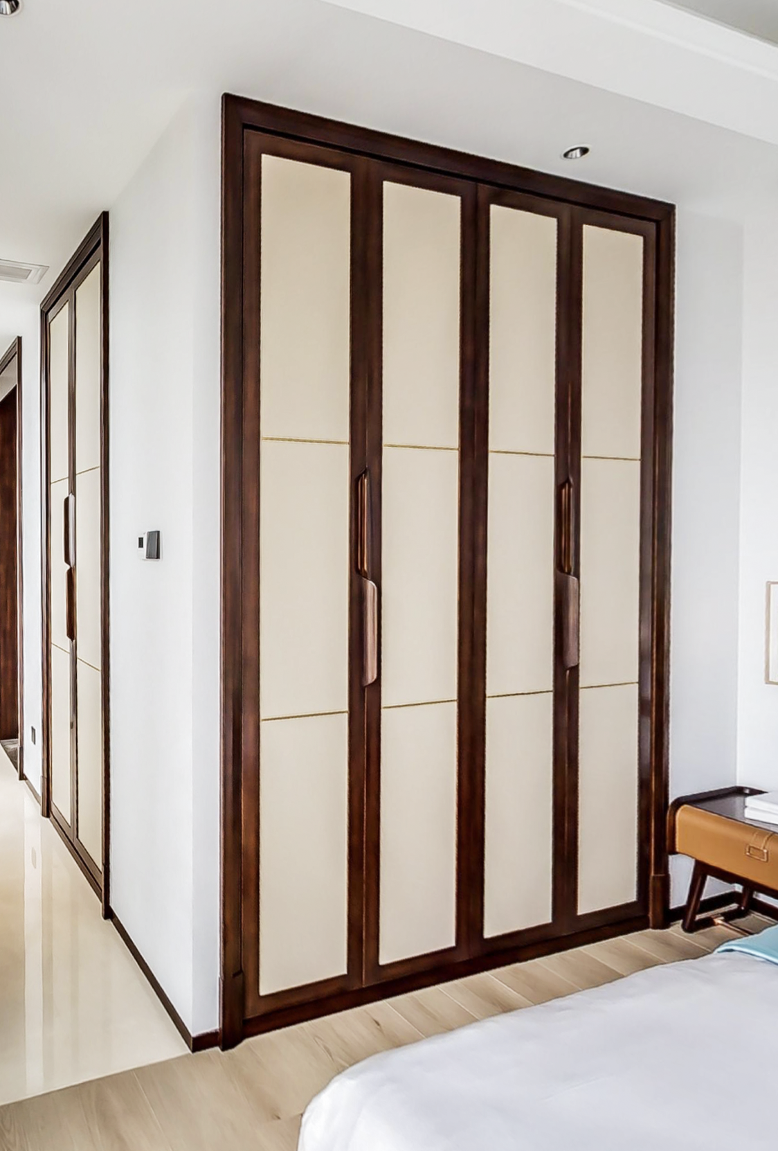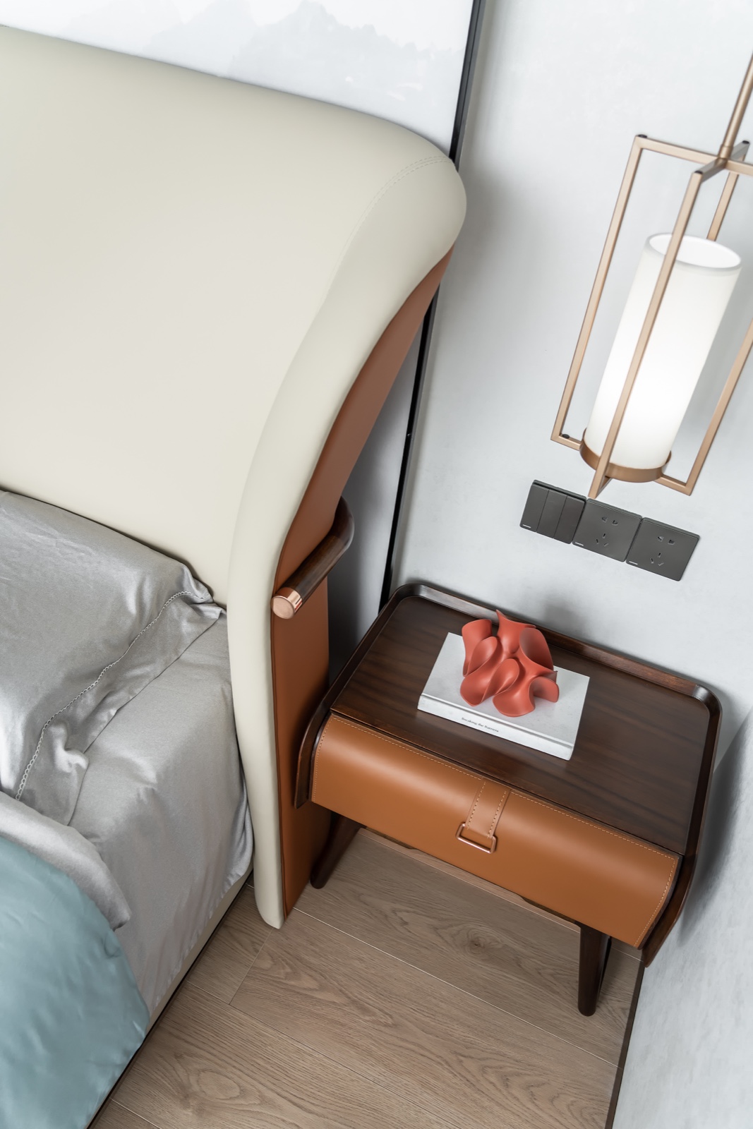 嵌入式衣柜,中式设计,在体量上满足更换衣服、置放物品的需求。同为白鹭色的大床,床头皮质软包,柔和舒适,造型大气优雅。两侧的棕色皮质床头柜,中西合璧,兼顾了实用性和装饰性。床头上方的一幅水墨画,自有一种云淡风轻任鸟飞的意境。