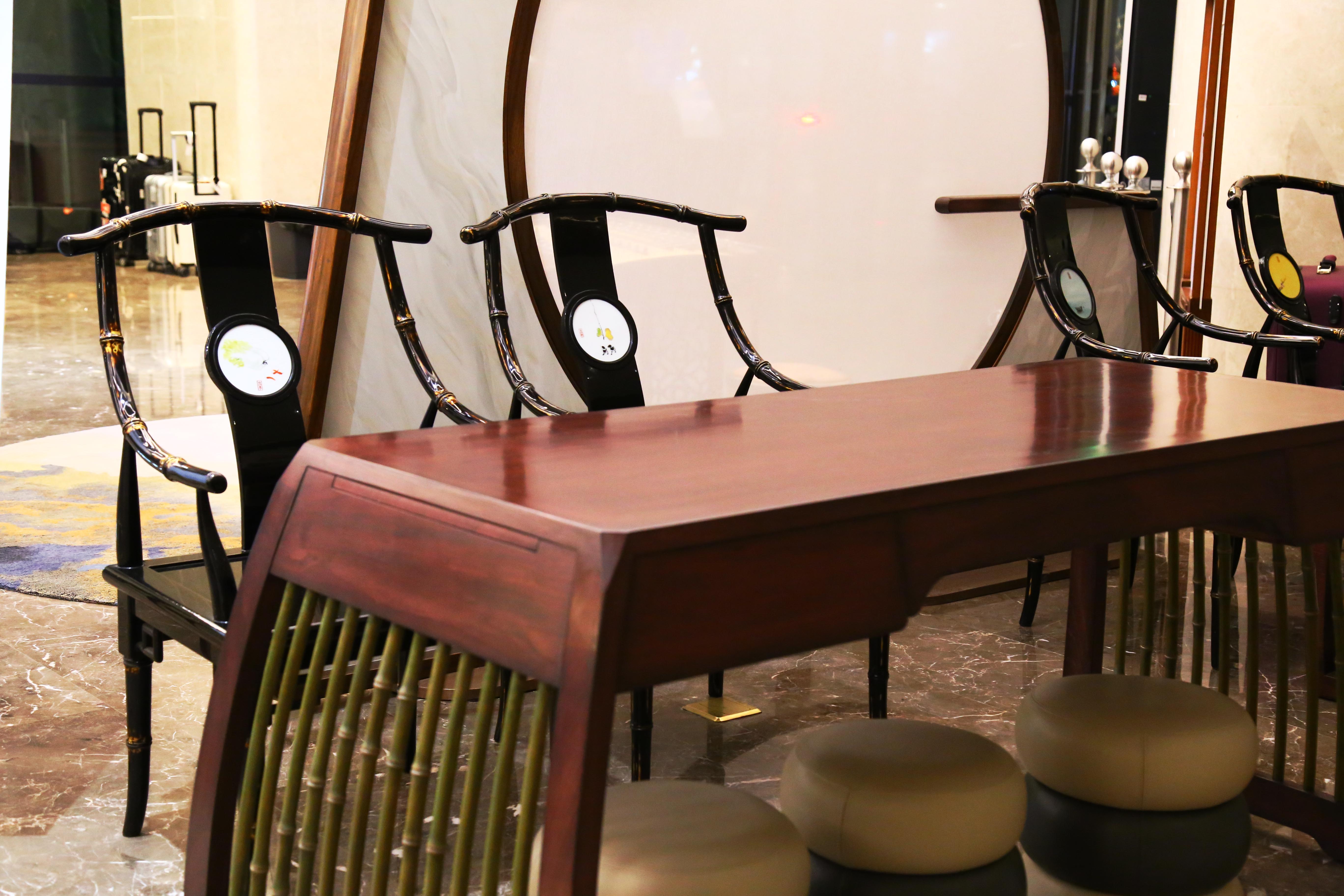 进博会期间,亚振家居在绿地铂瑞酒店分会场设置非遗互动体验区,展出「AZ1865屏风」、「本然妆凳」、「丝路台」等代表作,结合传统技艺表演与现场音乐演奏,让观众在沉浸式体验中感受木艺的肌理、乐声的流动,使非遗从“展柜故事”转化为“生活艺术”。